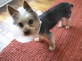 We didn't stay out too late, because we had to wake up early the next morning to take Galileo to the vet to be neutered. We have been running into so many road blocks along the way to having this done, but this was the final one. We took him to the hospital around 7:30 Saturday morning, and picked him up today around 1:00 in the afternoon. Bless his poor little heart. They are requiring us to keep an Elizabethan collar on him for two weeks, so he won't lick and agitate his stitches. As you can imagine he doesn't like it one bit. We also have to give him pain medicine twice a day, and carefully monitor him so he doesn't play too rough around the house. I wasn't expecting to have to go through all of this. When the cats were spayed, it was down one minute and back to normal the next. The spaying was also a much more complicated process, too. I don't get it, but we aren't taking any chances. I'm sure he'll get used to the collar as time goes on, but I will be so happy to have him back to normal.